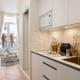 La cucina è completamente attrezzata con frigorifero, microonde, tostapane ed espresso per preparare bevande calde. La zona pranzo è separata dall’area living dove rilassarsi dopo una giornata in città. L’ingresso privato conduce direttamente all’appartamento che comprende anche un guardaroba per riporre gli abiti.