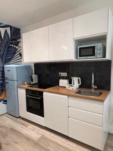 The apartment features a spacious living area with a flat-screen satellite TV and a fully equipped kitchen that includes modern appliances such as an oven and dishwasher. The bathroom provides either a bathtub or shower, along with bathrobes and a hairdryer for added convenience. Fresh towels and linens are supplied for your stay.