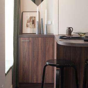 Die Küche ist ausgestattet mit einem Kühlschrank und einer Mikrowelle, einem Toaster sowie einer Kaffeemaschine und einem Wasserkocher.