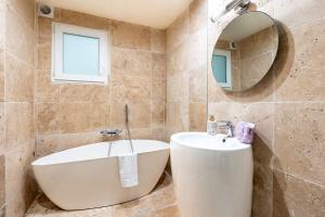 The apartment includes one bedroom with an extra-long bed and non-feather pillows, along with heating and a fan for comfort. The bathroom provides both a shower and bathtub, accompanied by shampoo and a hairdryer. Guests can enjoy entertainment on the flat-screen TV with video-on-demand services such as Netflix.