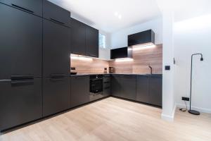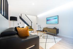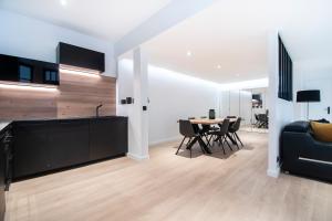 The apartment features a living room with a sofa and flat-screen TV equipped with streaming services. The kitchen includes an oven, microwave, stovetop, and coffee machine, complemented by wine glasses and bottled water provided for guests. Both bedrooms include non-feather pillows and heating is available throughout.