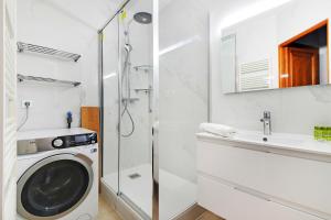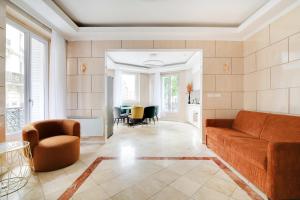 The accommodation features three bedrooms alongside a comfortable living room and two bathrooms. A fully equipped kitchen invites you to prepare meals at your convenience, while the lounge area includes a sofa and flat-screen TV for relaxation after exploring Paris. The floors are finished with elegant tile or marble.