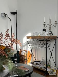 This one-bedroom apartment features a cozy living room complete with a fireplace and an adjoining dining area, creating an inviting space to relax or entertain. The kitchen comes fully equipped with an oven and cookware for guests who enjoy preparing their own meals. Throughout the apartment, you’ll find parquet floors complemented by rugs that add warmth underfoot, soundproofing ensures a quiet stay.