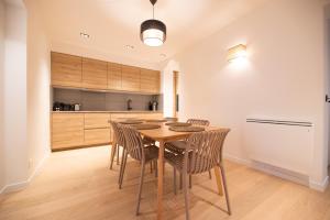 The spacious accommodation features two separate bedrooms and two private bathrooms equipped with either a bathtub or shower. The fully equipped kitchen includes an oven, microwave, toaster, and dining area. The living room contains a flat-screen TV with streaming services available. Guests benefit from heating throughout the apartment and can enter via a private entrance for added privacy.